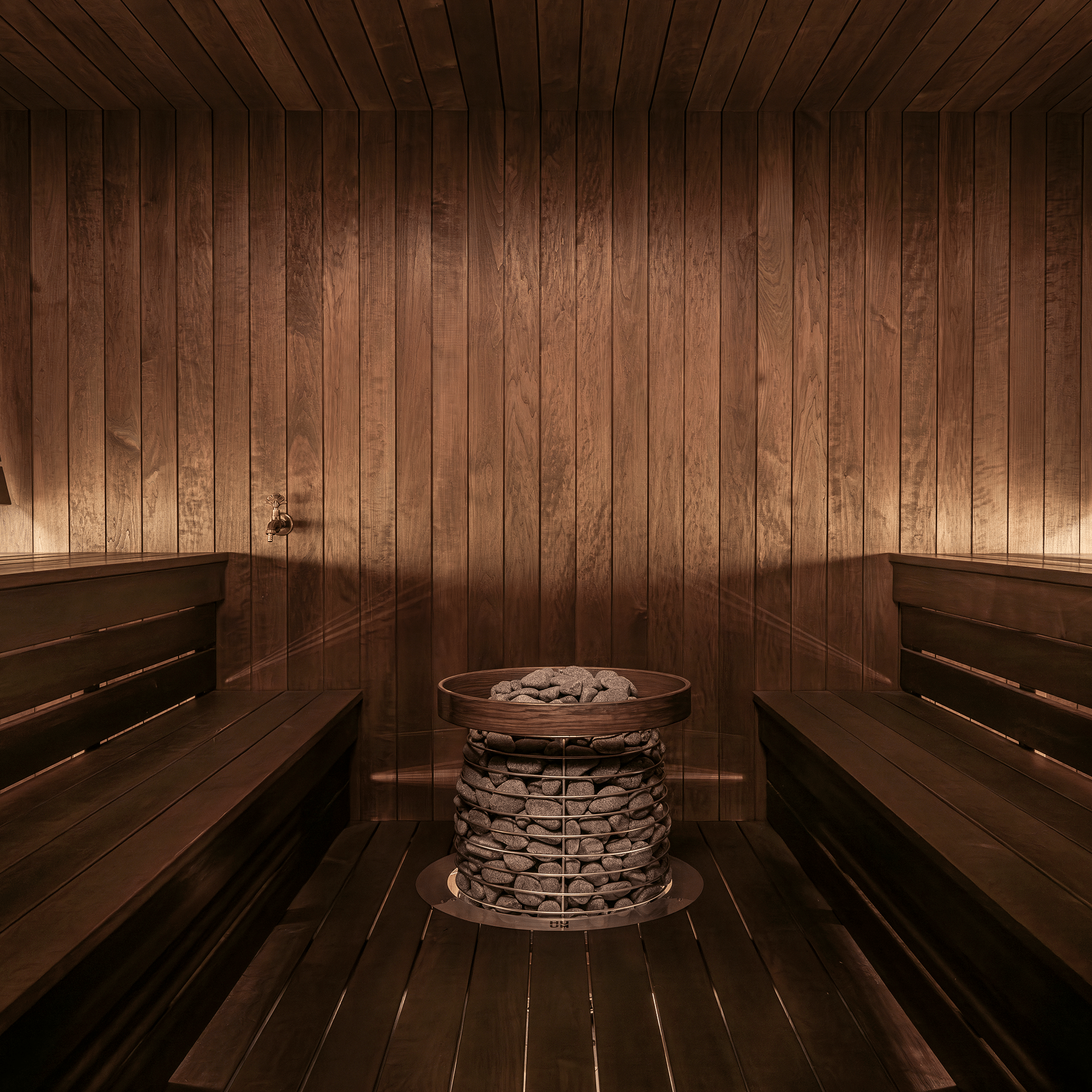 The HUUM HIVE electric sauna heater is an elegant solution for bigger saunas, for example, for spas and gyms. This floor-mounted heater holds up to 250 kg of stones, which ensure long-lasting hot steam even for larger groups, without compromising on design.