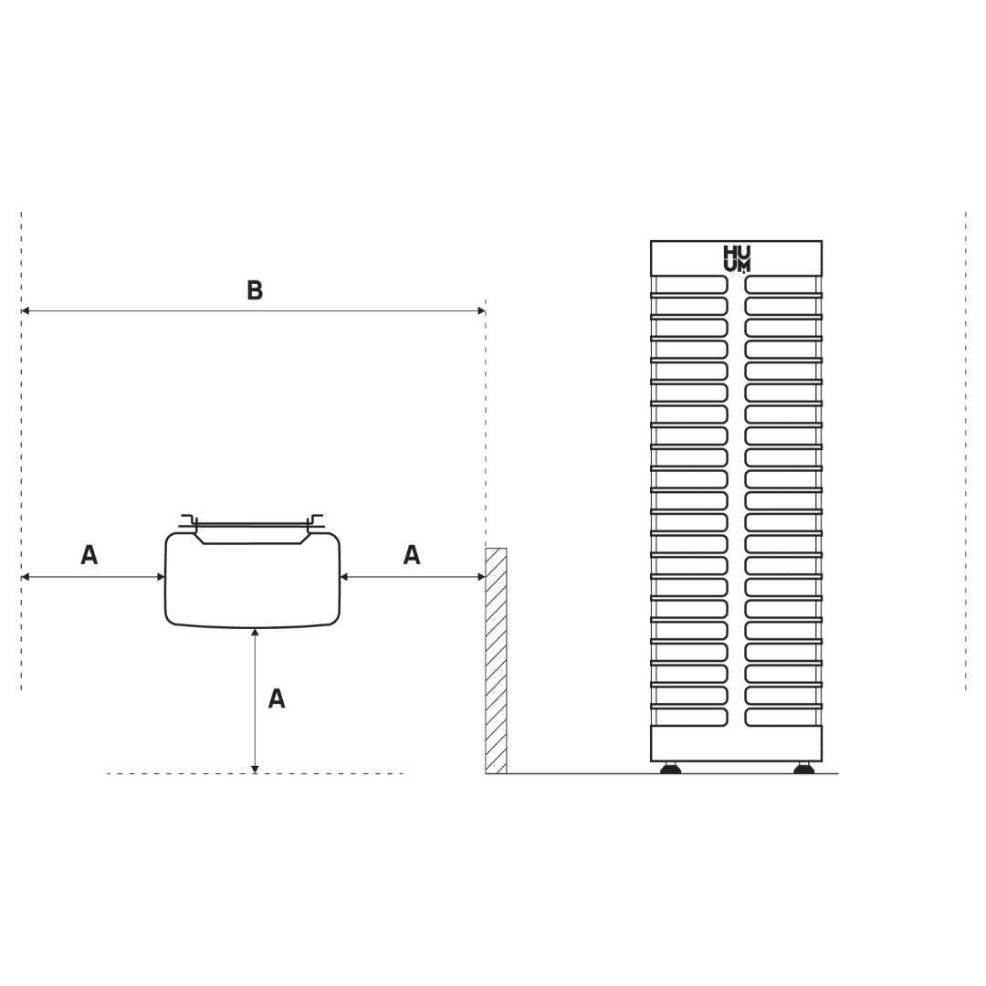 The compact STEEL Mini electric sauna heater has extremely short safety distances to combustible materials. This heater is a wall-mountable model that is an ideal choice for small saunas. Thanks to the well-optimized design, the safety distances of the STEEL Mini from the sides of the heater’s body are only 5cm.